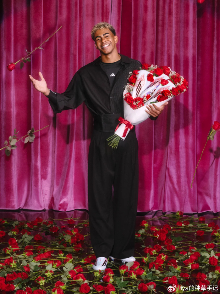 画面背景是粉红色的幕布,亚马尔整个人被一堆红色玫瑰花淹没,就剩一颗脑袋和两只穿着新球鞋的脚倔强地露在外面。
